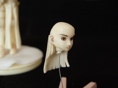 後ろ髪は3パーツでできているので、フルカラー塗装したい場合は仮留めしてから着色するのも手だけど、頭に接着するときはバラさないとできない。