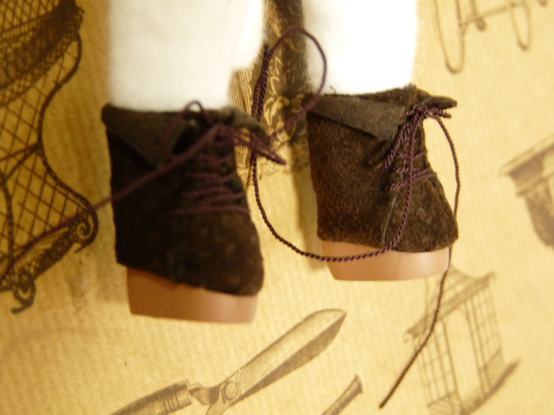草履の予定でしたが靴にしました。革です。スエードです。前作と同じように底に磁石を仕込んでいるので厚底です。