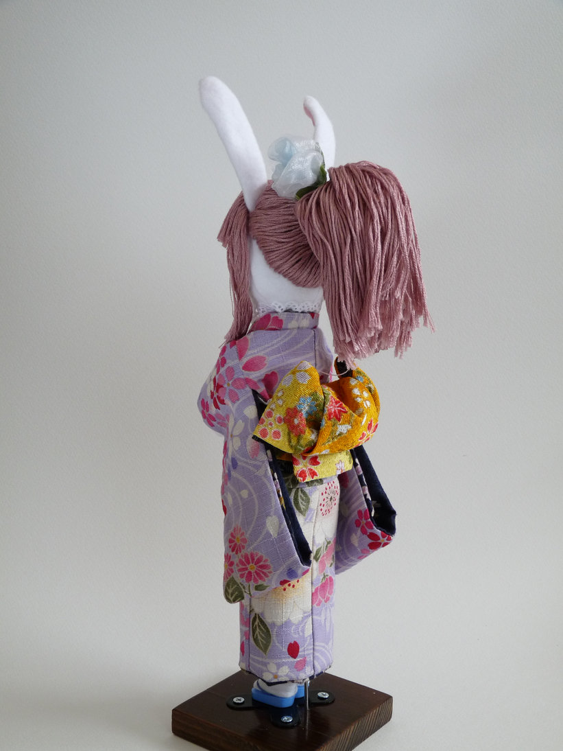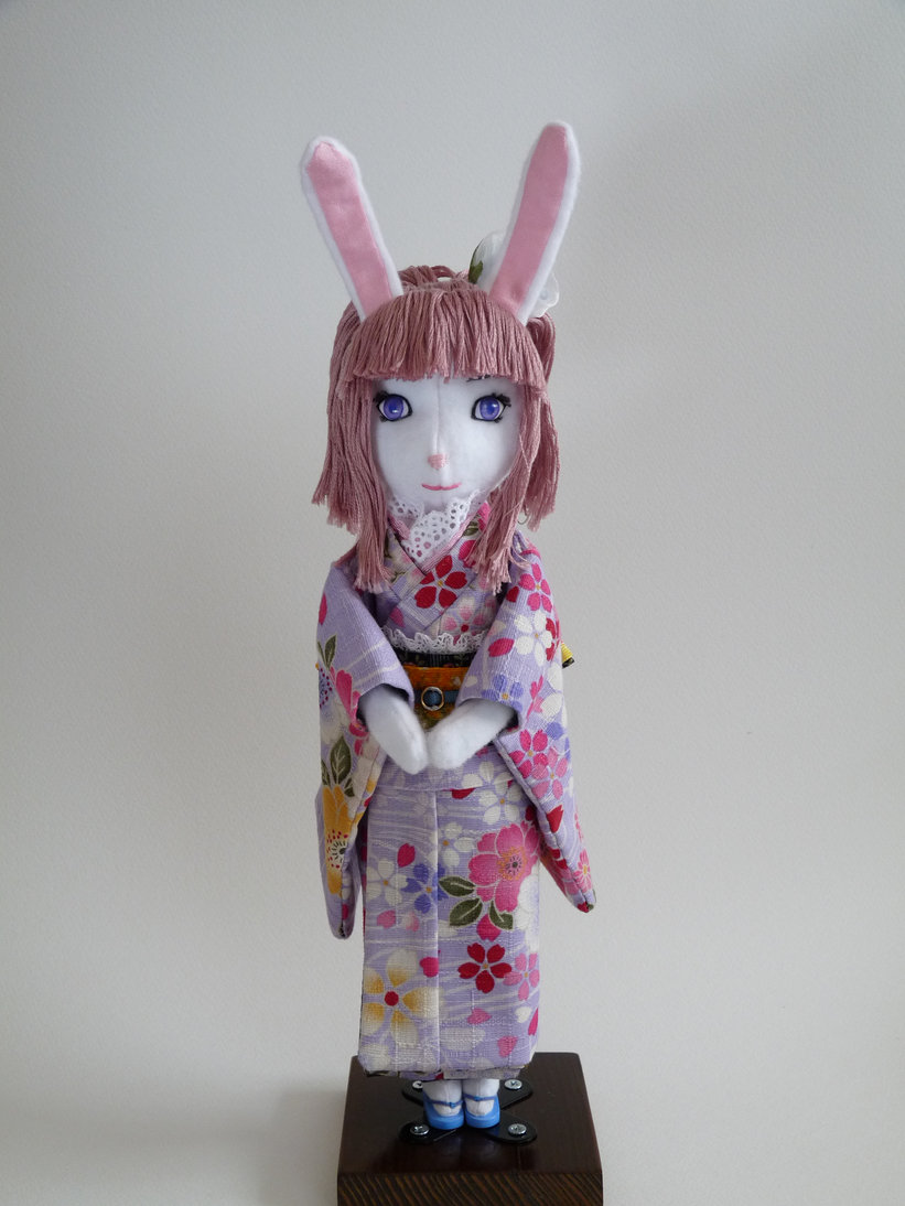 台座は木板で、足の磁石がつくように鉄をネジ止めし、本体を直立させるのにピアノ線を立ててあります。ピアノ線を裾から入れて帯まで届いています。