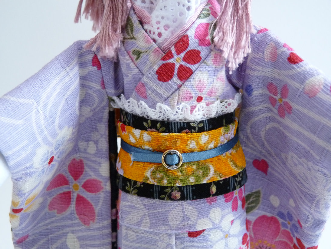 黄色のちりめんは帯です。本当に帯を結ぶのではなく胴に巻く1本と背中の結び2本で作ります。胴のは黒の柄に黄のちりめん、ですが結びは黒柄は裏地のみです。つじつまが合いません。
