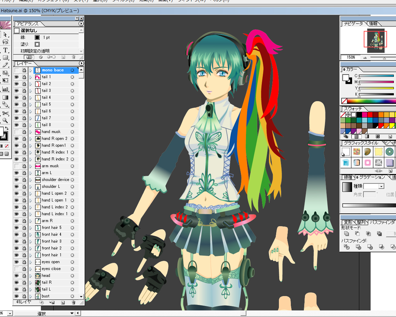 そんな理由とは関係なく、ミクさんの髪があまり描かれていないのはマスクして別に用意した色を表示しようと思ったからです。実際に合わせると上手くいかないものでそのままのをつかいました。