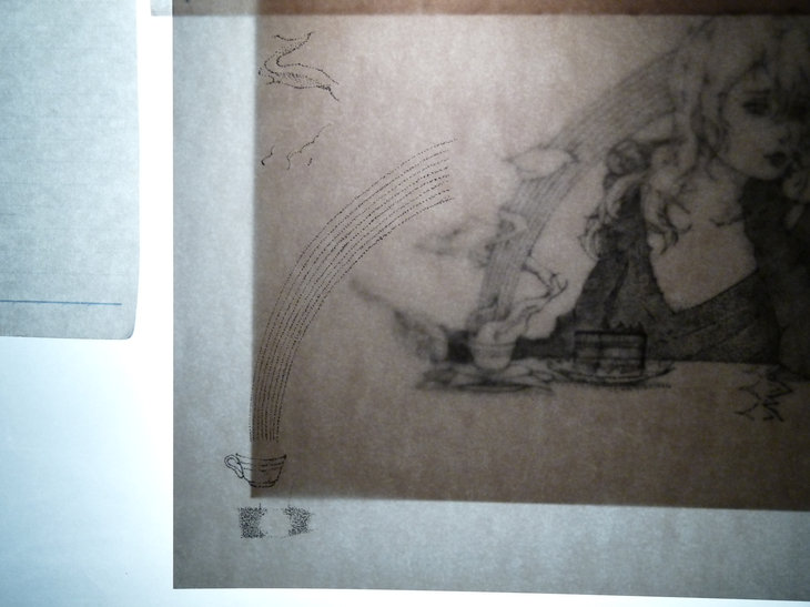 といってもそんな張り切るものでもなく、メモ帳やら紙切れやらにグチャっと描きながら考えます。パンフ用カットは毎度描いているんですが、最初の頃は下絵だけ描いてクズノ氏にお任せていたんですけど、いつからか点描にしてからはお任せしていません。イラストはこれで完成でちょいとテキストをかぶせるだけなので簡単なフォトショ知識でオーケーなのです。