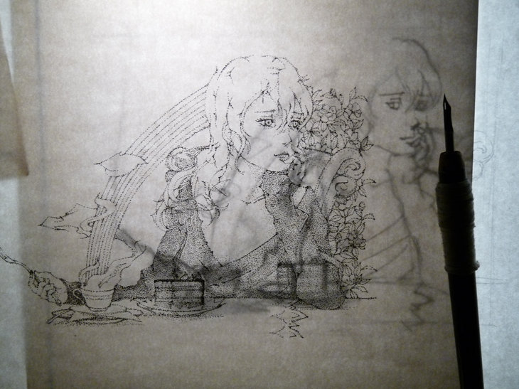 目安を引いたものをトレースして点を打ちます。丸ペンです。