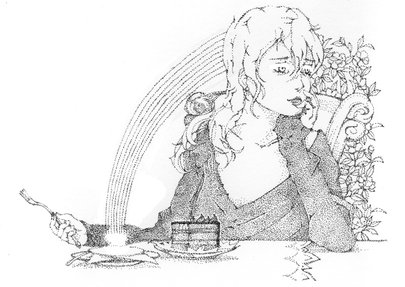ウェブで告知する用にイラレで色をつけました。色付けは少し前からやってます。着色はフォトショでがっちりつけるのでなく、イラレの軽いグラーデーションで行います。円形と線のちょっとしたものです。虹と頬はメッシュを使っています。あくまで点描っていうことで。