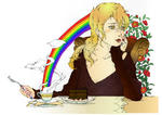 中はベースとなる画像。カップを消して隠れていた腕と虹を補間してある。女性の上まぶたも消した。