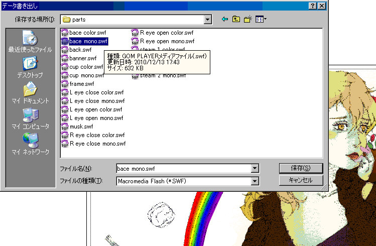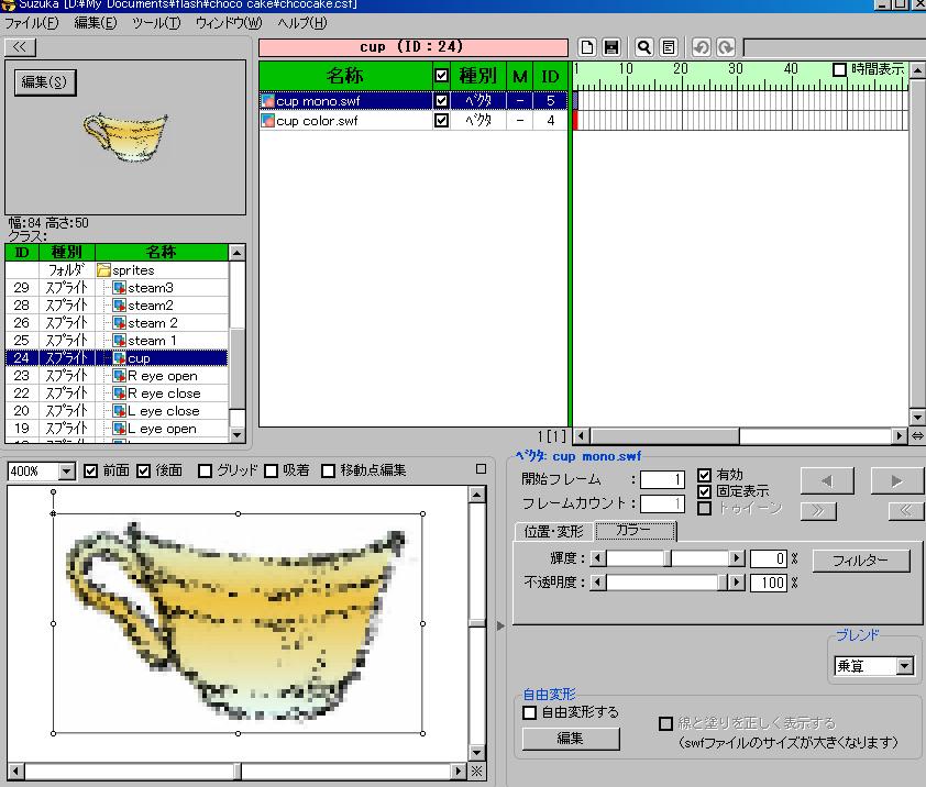 湯気なんかをユラユラさせたかったのですが、ならば、スプライト内でswfごとに自由変形させればと試しましたが、色ファイルは変形できるのですが点描の方は指定しても反映されませんでした。そもそも点描画像は透過できないのだからswfではなくjpgの方が良かったのでは?それなら変形できたのでは?と思います。今後試そうと思います。