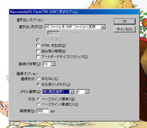 イラレでのswf書き出し時に圧縮しました。そもそも表示サイズが完成のFLASHより大きく作ってあるのでかなり圧縮しても問題ありません。
